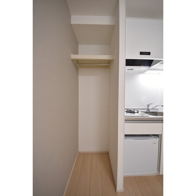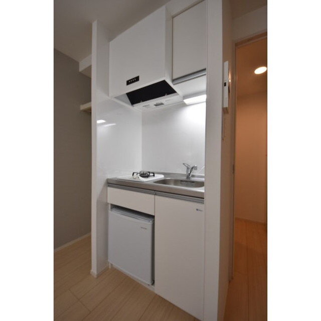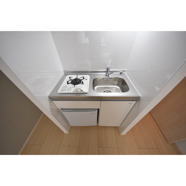 室内はワンルームタイプで、1口ガスキッチン(ミニ冷蔵庫付き)や浴室乾燥機・温水洗浄便座など便利な設備を完備。エアコン・室内物干し・シューズボックスもあり、快適な暮らしをサポートします。